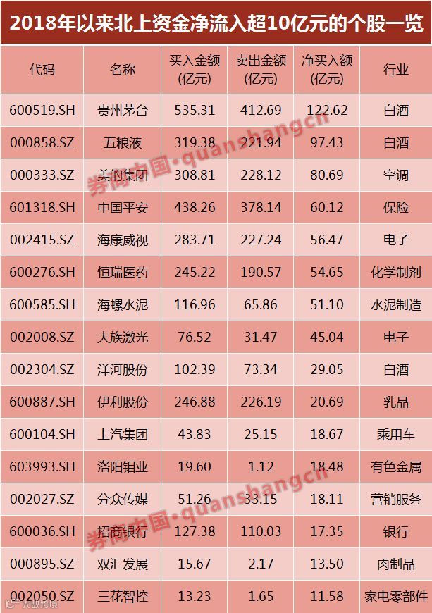 据券商中国记者统计,北上资金白酒、家电等消费类个股。具体来看,年初至今北上资金净买入超过10亿元的个股共有16只,分别是贵州茅台、五粮液、美的集团、中国平安、海康威视、恒瑞医药、海螺水泥、大族激光、洋河股份、伊利股份、上汽集团、洛阳钼业、分众传媒、招商银行、双汇发展和三花智控。其中,北上资金扫货贵州茅台超百亿,达122.62亿元。
