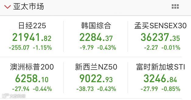 亚太市场也出现集体回调,日经指数跌逾1%,韩国综合指数跌逾0.4%。