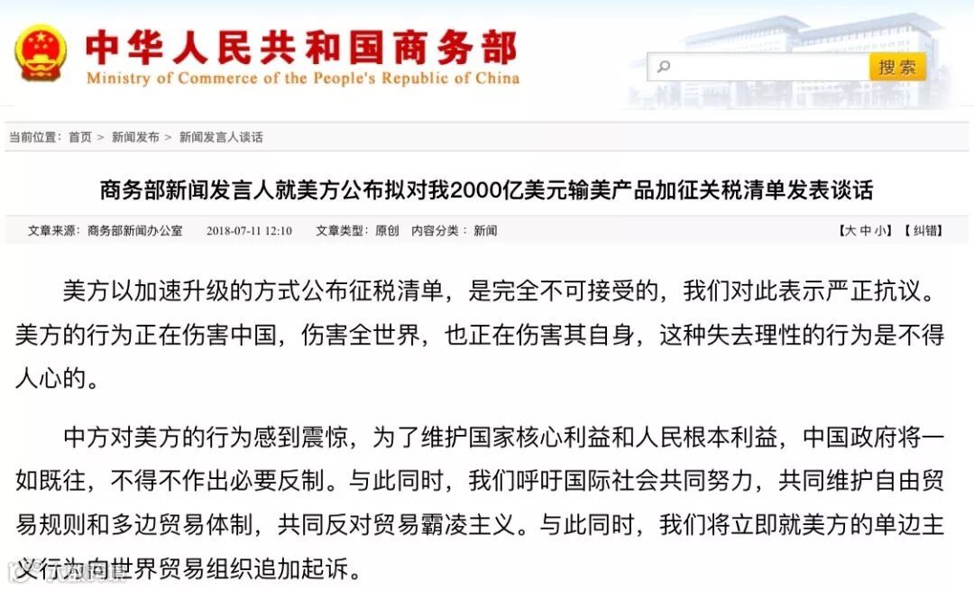 针对美方拟对我国2000亿美元输美产品加征关税,商务部新闻发言人最新表态,表示“完全不可接受,严正抗议,不得不作出必要反制”。美方的行为正在伤害中国,伤害全世界,也正在伤害其自身,这种失去理性的行为是不得人心的。