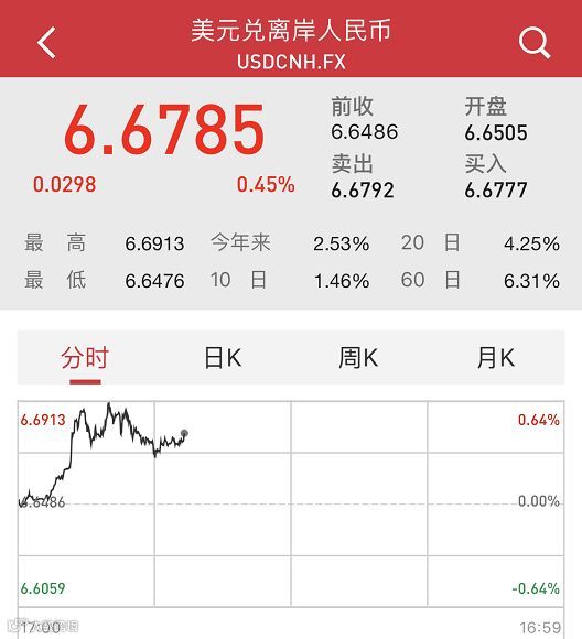 汇率市场方面,离岸人民币盘中连破五道关口,跌逾400点至6.69下方,截至券商中国发稿,离岸人民币维持在6.67附近。
