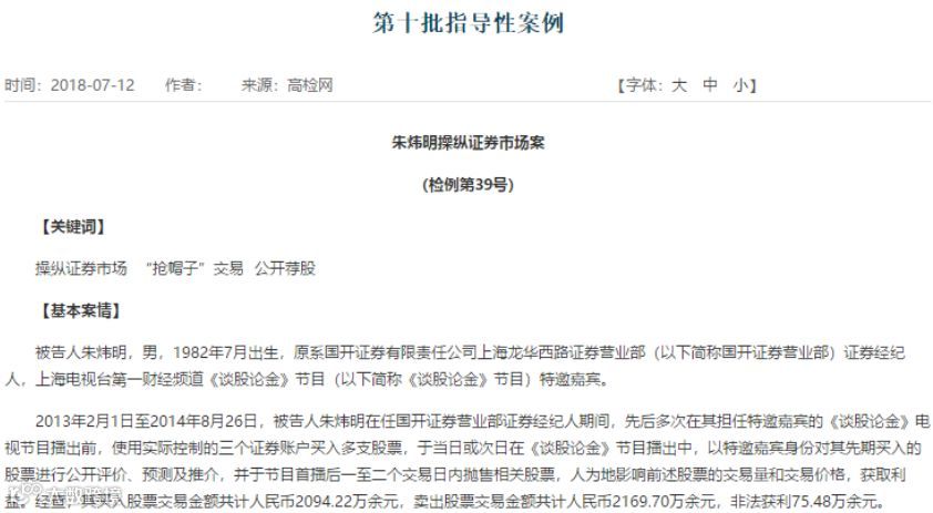 这起以“抢帽子”交易手段操纵证券市场案成为指导性案例。此前证监会已以对朱炜明实行了“没一罚三”1810万的罚单,同时对其采取终身证券市场禁入措施。