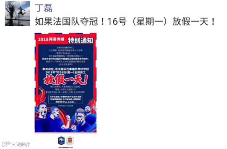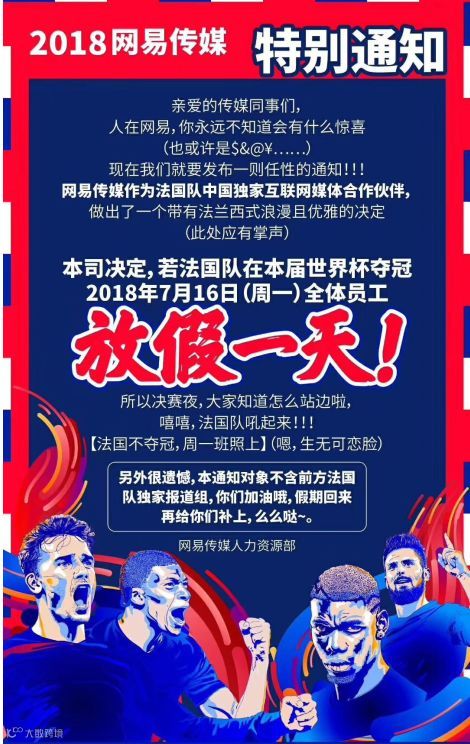 以及他们——网易承诺法国队夺冠,全体员工休假一天!如今法国夺冠了,网易员工现在应该是所有球迷最羡慕的人。