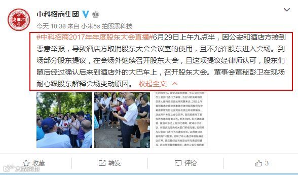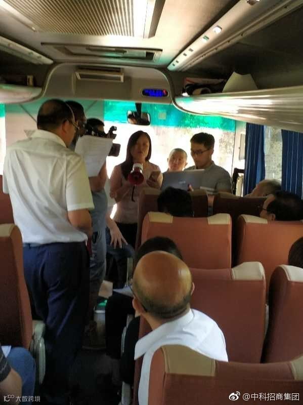 今日上午九点半,中科招商官方微博称,因公安和酒店方接到恶意举报,导致酒店方取消股东大会会议室的使用,且不允许股东进入会场。到场部分股东提议,在会场外继续召开股东大会,且这项提议经律师认可,股东们随后经过确认后来到酒店外的大巴车上,召开股东大会。