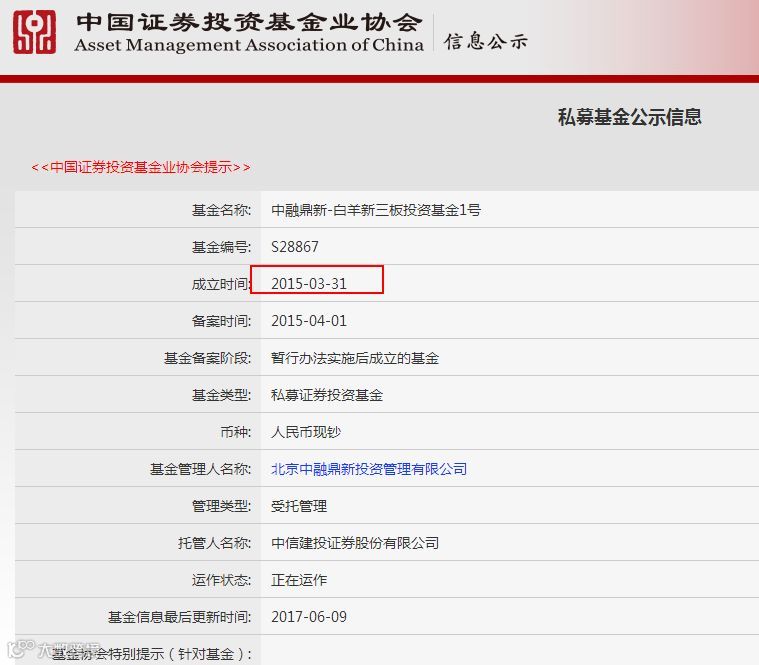 记者查询中融鼎新官网发现,6月5日发布的最新一期白羊新三板投资基金1号仍以中科招商被强制摘牌当月(2017年12月)全月平均交易价格(约0.59元/股)作为公允价格进行基金估值,据此计算本基金截至2018年5月31日的五月份基金份额净值为0.1985元。