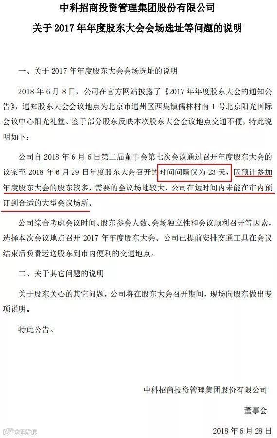 中科招商在公告中解释称,发布议案离股东大会召开仅23天,因预计参加年度股东大会的股东较多,需要的会议场地较大,公司在短时间内未能在市内预订到合适的大型会议场所。不过,中科招商公告称已提前安排交通工具在会议结束后负责运送股东到市内便利的交通地点。