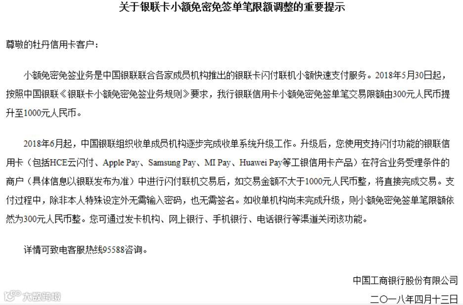 工行牡丹信用卡公告称,自6月起,将小额免密免签的单笔限额由300元调至1000元。