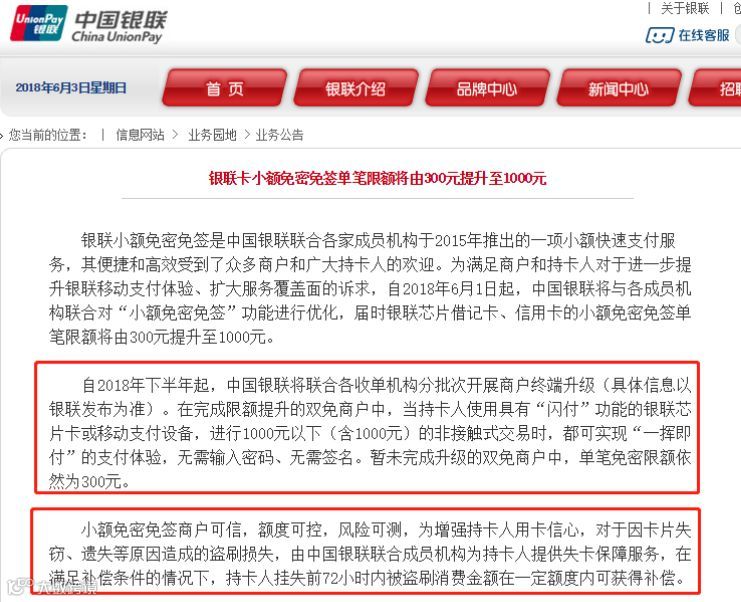 招商银行公告称,自今年5月2日起,该行银联芯片借记卡的小额免密免签单笔限额将由300元提升至1000元,单日累计限额将提升至2000元;
