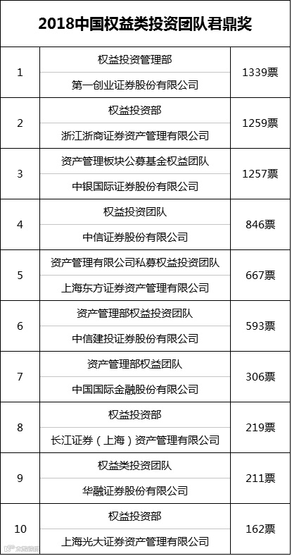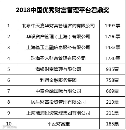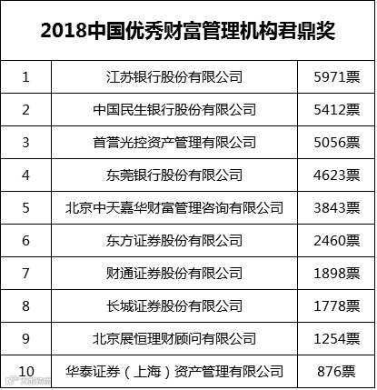 从具体投票情况来看,综合类大奖“2018中国优秀财富管理机构君鼎奖”的角逐最为激烈,这个奖项主要是从公司2017年的资产管理总量、较上一年的增长率、平均收益率、投资能力、风控能力等方面来考察公司的整体资产管理水平。