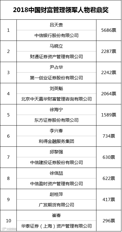 另一项人物大奖,“2018中国财富管理领奖人物君鼎奖”,中信银行的吕天贵先生已经获得近6000票,是排名最末的300多倍。