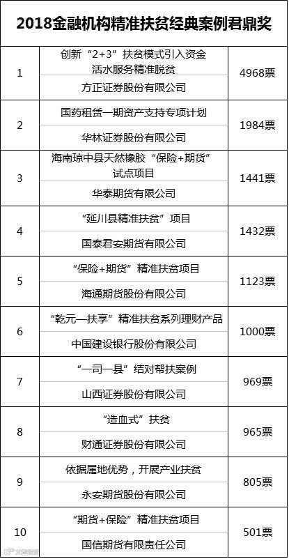 今年新增加的“2018金融机构精准扶贫经典案例君鼎奖”一共有18项项目参评,各公司对这个奖项也都表现出了很大的热情,但排名首位的项目的得票数甩开最后的项目近500倍。