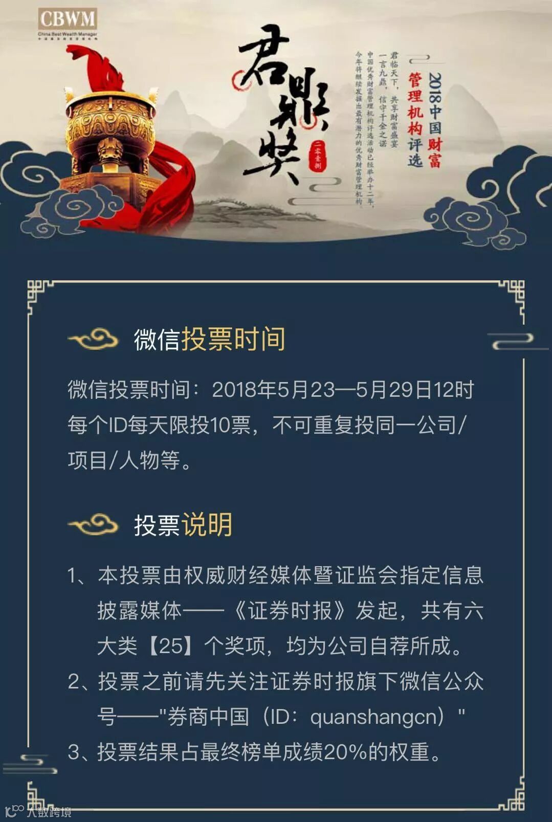 本次财富管理机构君鼎奖评选的微信投票截止时间为明天(5月29日)12:00,截止今天下午17:00,微信投票一共吸引了近35万人次的投票,参评机构各出奇招宣传投票。