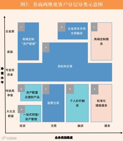 将券商的所有客户按照净值水平以及业务类别两个维度共分为九类服务、六类客户(见图3)。