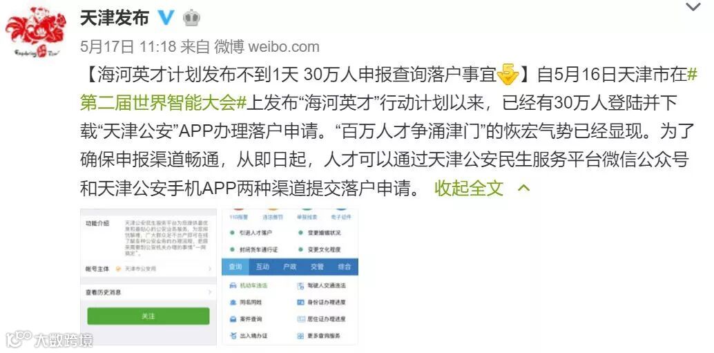 据天津发布消息,自5月16日天津市在第二届世界智能大会上发布“海河英才”行动计划以来,已经有30万人登陆并下载“天津公安”APP办理落户申请。