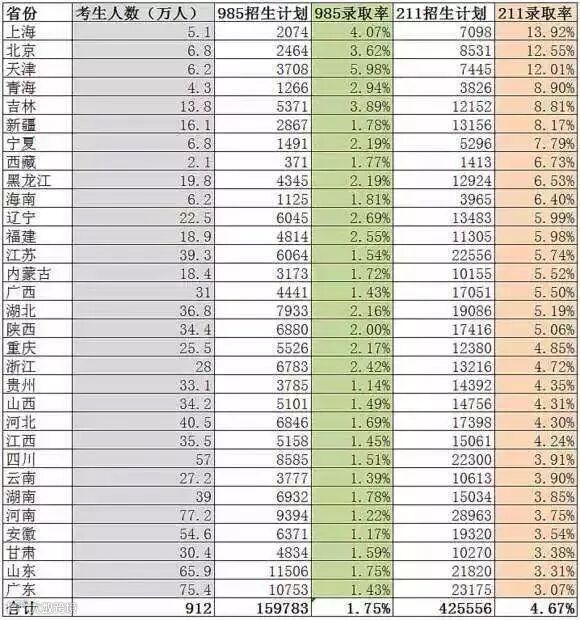 由下图不难看出,各省的高考难度还是有些差异的,最简单的是北京、上海和天津,也是我国高校资源最丰富的三个地方。天津211录取率仅次于上海和北京,位居第三,而985录取率则位居全国第一。