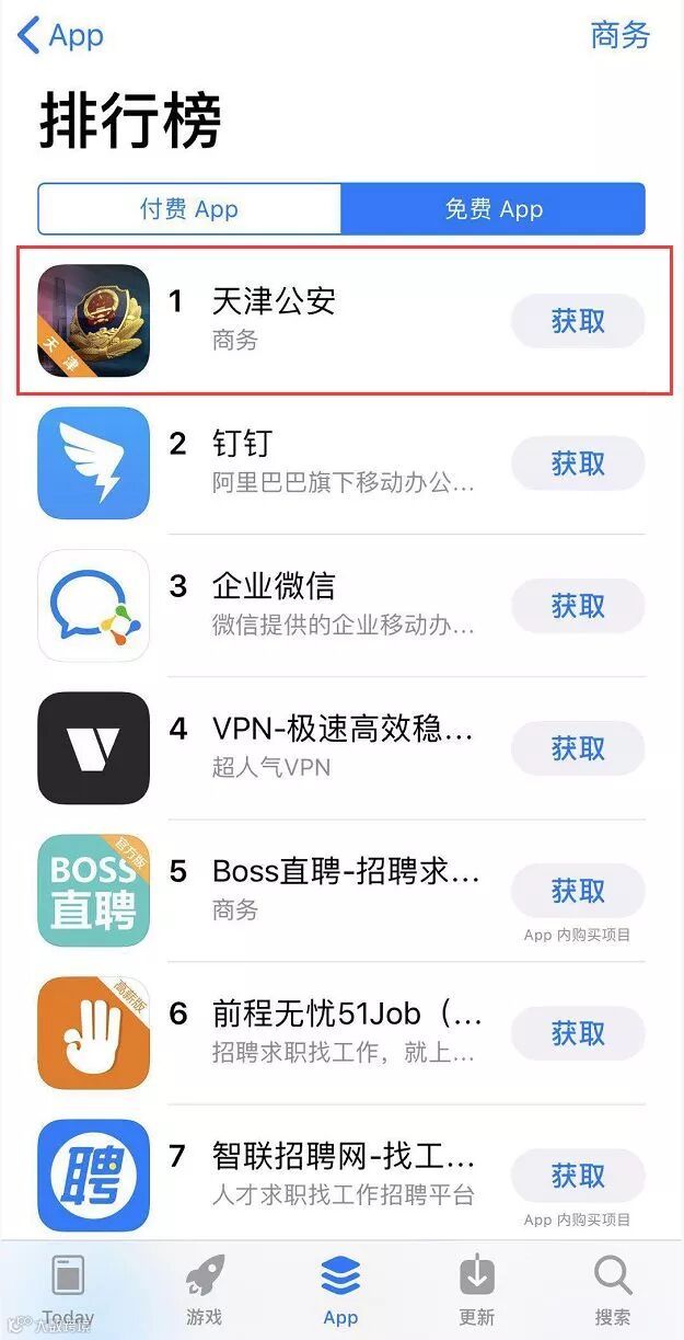 据天津发布消息,天津海河英才计划发布不到1天,已有30万人申报查询落户事宜。数据显示,截至17日早上8:30,已经有30万人登录并下载“天津公安”App办理落户申请。这也让这款“无人问津”的App冲到了App Store的免费商务App排行榜第一位。
