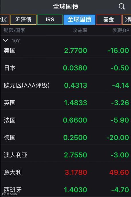 从上图来看,由于投资者大面积抛售意大利债券,导致意大利十年期国债收益率昨天攀升了49.60个基点。而美国10年期国债收益率则跌了十多个点,跌破2.8%的水平,而德国10年期国债收益率则跌了20个基点。