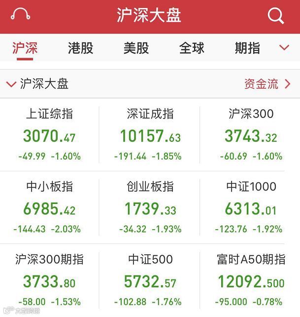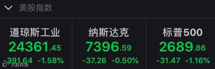 而美国股市也不乐观。道指跌391.64点,或1.58%,报24361.45点;标普500指数跌31.47点,或1.16%,报2689.86点;纳指跌37.26点,或0.50%,报7396.59点。美国大银行股下跌,高盛下跌3%,摩根大通下跌3.7%,摩根士丹利下跌5%。