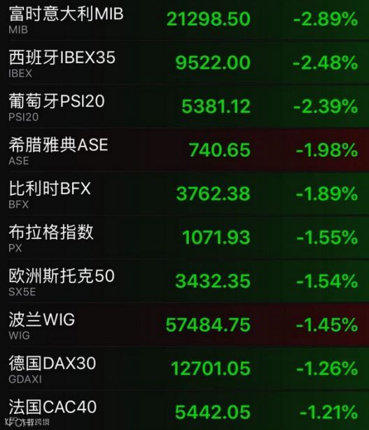 不仅如此,意大利的金融危机已经波及到了全欧洲,整个欧洲的股市都处于大跌之中。欧洲泛欧绩优300指数收跌1.31%;英国富时100指数收跌1.2%;德国DAX指数收跌1.6%;法国CAC指数收跌1.4%;西班牙IBEX指数收跌2.2%。