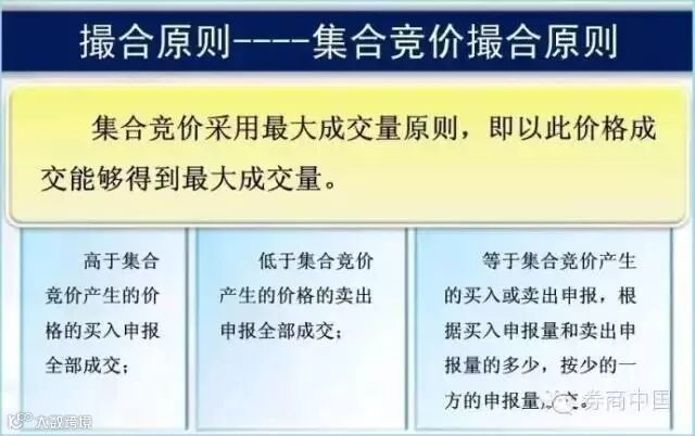 集合竞价最大成交量原则,即以此价格成交能够得到最大成交量。高于集合竞价产生的价格的买入申报全部成交;低于集合竞价产生的价格的卖出申报全部成交;等于集合竞价产生的价格的买入或卖出申报,根据买入申报量,卖出申报量的多少,按少的一方的申报量成交。