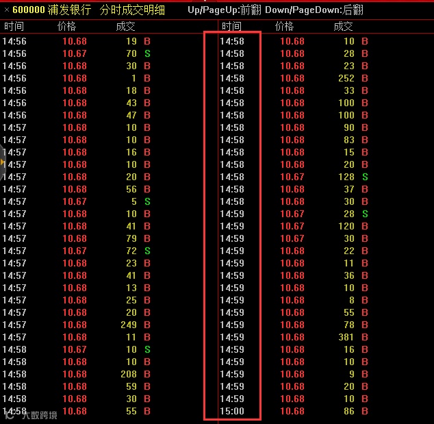 上交所股票——浦发银行,14:57之后,与此前成交方式无异,继续采用连续竞价。