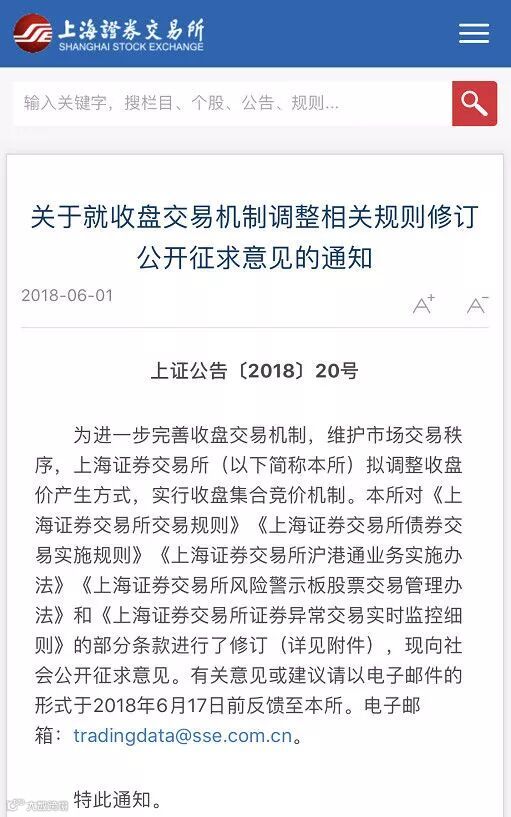 6月1日,上交所表示,为进一步完善收盘交易机制,维护市场交易秩序,上交所拟调整收盘价产生方式,实行收盘集合竞价机制。