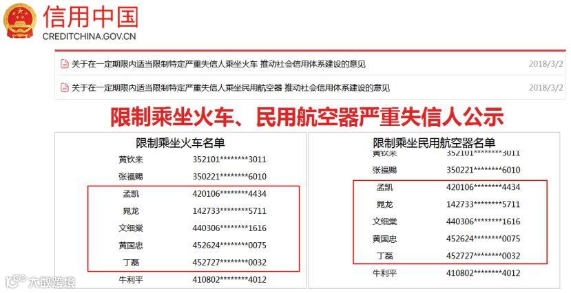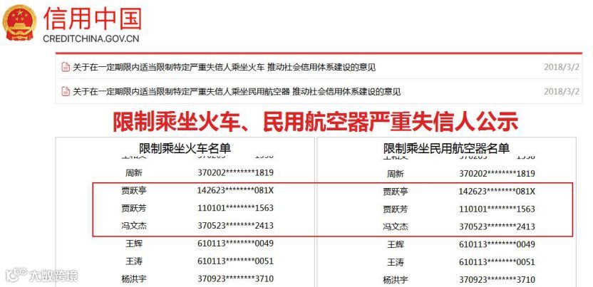 记者注意到,今年3月,为落实习近平关于构建“一处失信、处处受限”信用惩戒大格局的重要指示,国家发改委在官网公布,与财政部、证监会、铁路总公司、民航局等联合发布了《关于在一定期限内适当限制特定严重失信人乘坐火车 推动社会信用体系建设的意见》和《关于在一定期限内适当限制特定严重失信人乘坐民用航空器 推动社会信用体系建设的意见》。