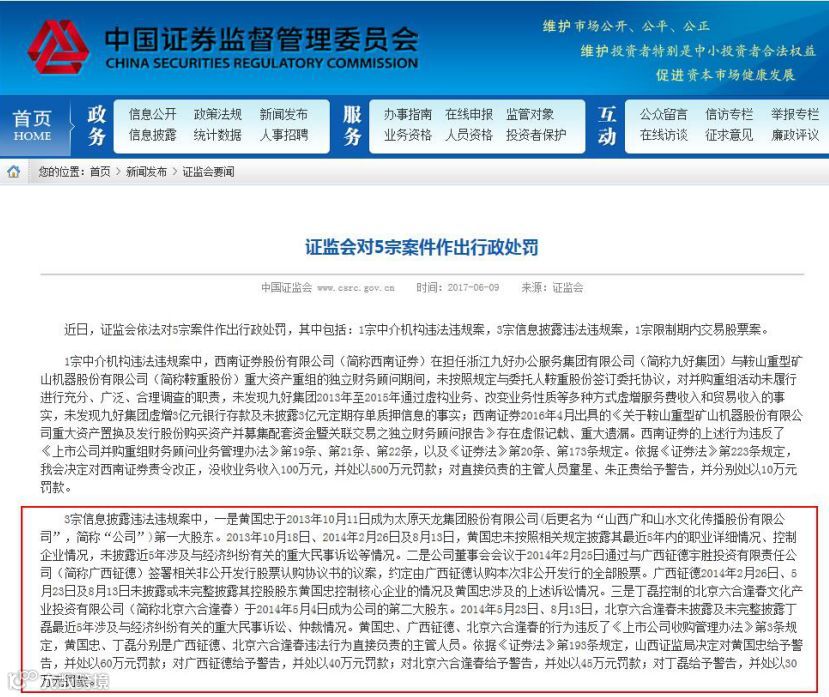 证监会认为,黄国忠、广西钲德、北京六合逢春的行为违反了《上市公司收购管理办法》第3条规定,黄国忠、丁磊分别是广西钲德、北京六合逢春违法行为直接负责的主管人员。依据《证券法》第193条规定,山西证监局决定对黄国忠给予警告,并处以60万元罚款;对广西钲德给予警告,并处以40万元罚款;对北京六合逢春给予警告,并处以45万元罚款;对丁磊给予警告,并处以30万元罚款。