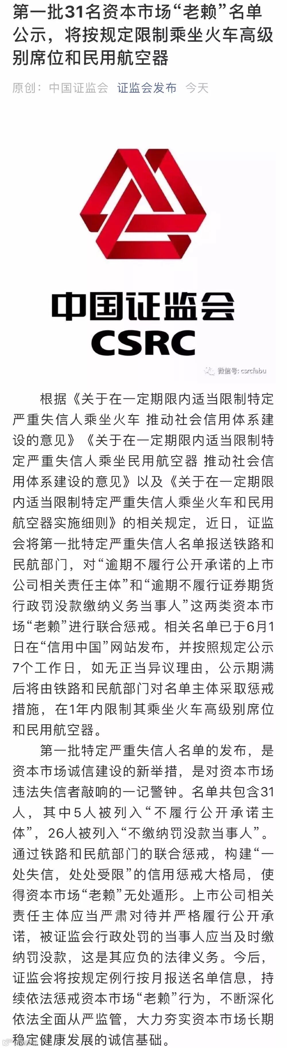证监会将第一批特定严重失信人名单报送铁路和民航部门,对“逾期不履行公开承诺的上市公司相关责任主体”和“逾期不履行证券期货行政罚没款缴纳义务当事人”这两类资本市场“老赖”进行联合惩戒。