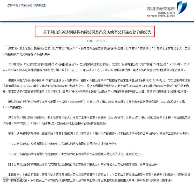 今年1月3日,因未履行业绩补偿承诺,深交所给予英达钢构和斯太尔实际控制人冯文杰公开谴责的处分。