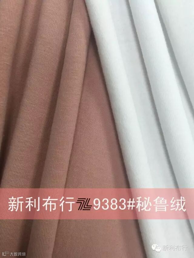 9383#秘鲁绒是2017秋冬主推产品,该产品是在秘鲁棉的基础上,正面添加食毛工艺,底面添加磨毛工艺而成的新产品,从图片看,丝丝绒绒的磨毛效果明显,上手的手感柔软、舒适,保暖效果绝对666~~~成份含有氨纶,有弹力,是一款做保暖内衣的优质面料。