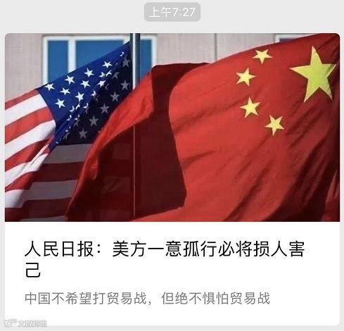 人民日报发表评论称,白宫挑起了世界两大经济体之间的贸易战,既损害双边利益,也破坏世界贸易秩序,中方第一时间表示了坚决反对。自从挑起贸易争端至今,美方的反复无常已成为“常态”,不仅损耗和挥霍了自己的国家信誉,也让中国进一步认清了特朗普政府蛮横无理、自私任性的面目。中方早就有言在先,中国不希望打贸易战,但绝不惧怕贸易战。对于美国看似意外的举动,中国已做好准备,有足够的决心和能力回击这场强加给我们的贸易战:一方面,同等规模、同等力度的征税措施已经上路,将给美方以痛击;另一方面,美方征税清单落地之日,就是双方磋商达成的所有经贸成果付诸东流之时。