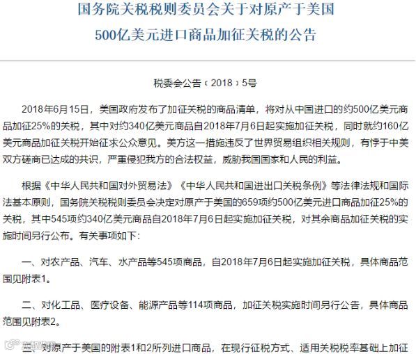 国务院关税税则委员会表示,2018年6月15日,美国政府发布了加征关税的商品清单,将对从中国进口的约500亿美元商品加征25%的关税,其中对约340亿美元商品自2018年7月6日起实施加征关税措施,同时对约160亿美元商品加征关税开始征求公众意见。美方这一措施违反了世界贸易组织相关规则,有悖于中美双方经贸磋商已达成的共识,严重侵犯我方合法权益,损害我国国家和人民的利益。