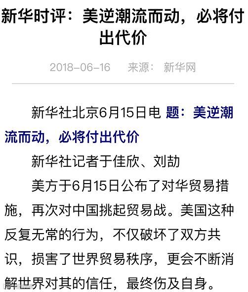 新华社也发表了评论,指出贸易战挑起方往往不感受到疼痛就不会停止其无理行为。面对美国的单方面挑衅,中方必将坚决予以强硬回击。中国捍卫国家和人民利益的立场始终不变,捍卫经济全球化和多边贸易体制的决心从未改变,中方绝不怕任何战争和困难,对特朗普政府以邻为壑、反复无常的行为,必将以同等规模、同等力度的措施反击,“对小打、中打以至大打,都有所准备”。