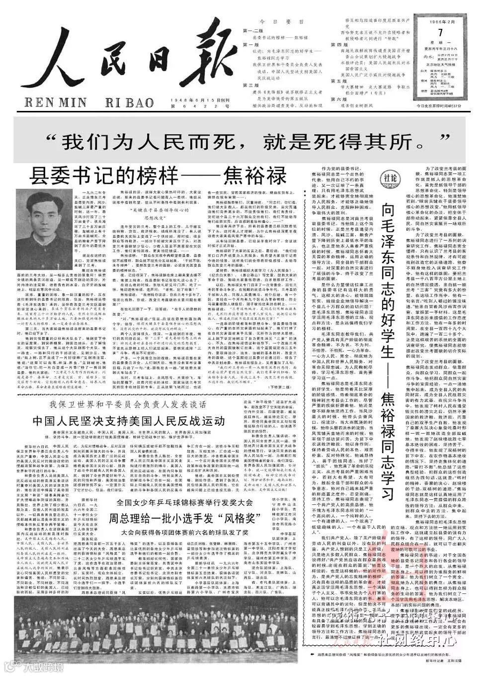 1966年2月7日,人民日报头版刊发长篇通讯《县委书记的榜样——焦裕禄》和社论《向毛泽东同志的好学生——焦裕禄同志学习》。