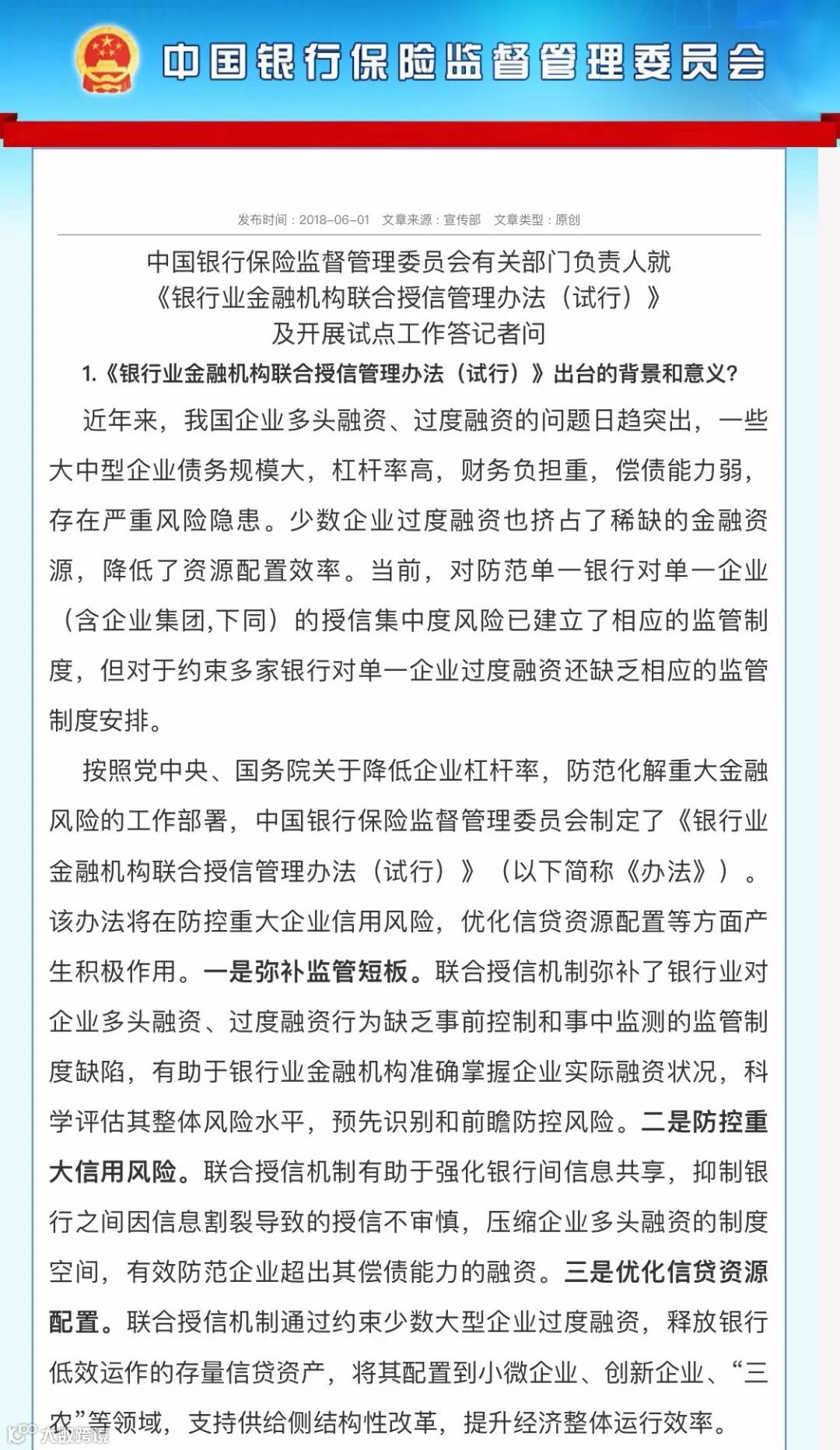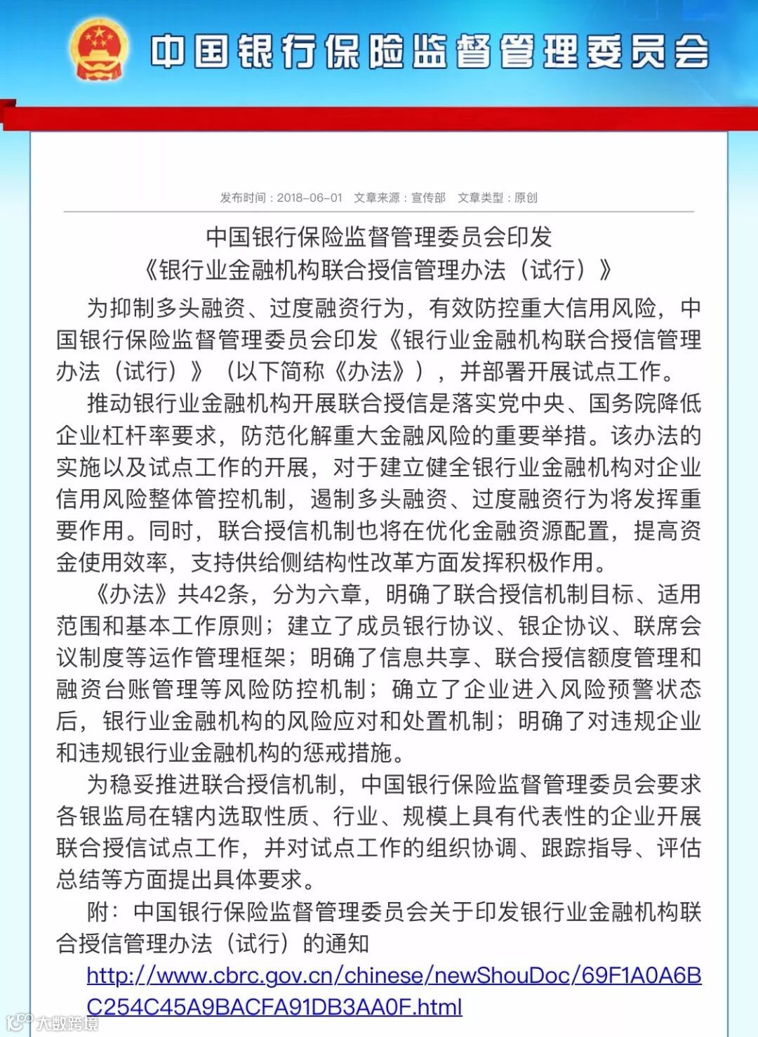 为抑制多头融资、过度融资行为,有效防控企业杠杆率上升引发的信用风险,6月1日,银保监会发布《银行业金融机构联合授信管理办法(试行)》,明确要求各地建立对部分企业的联合授信试点,纳入试点的企业以后的债务融资余额上限将不得超过银行业金融机构设定的联合授信额度。