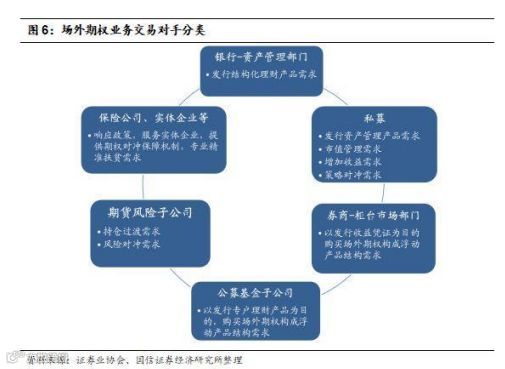 券商的交易对手,包括银行资产管理部门、私募、券商柜台市场部门、公募基金及子公司、期货公司风险子公司、保险公司等。其中,私募机构已经超过商业银行,成为券商场外期权的第一大交易对手。