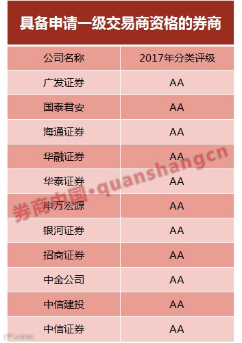 券商中国记者统计,最近一年分类评级在A类AA级以上的券商共有11家,包括中信、国君、海通、广发等,也就是说经证监会认可后的“一级交易商”不会超过11家,另外去年有29家分类评级为A类A级的券商,并具备自营资格的可申请“二级交易商”。