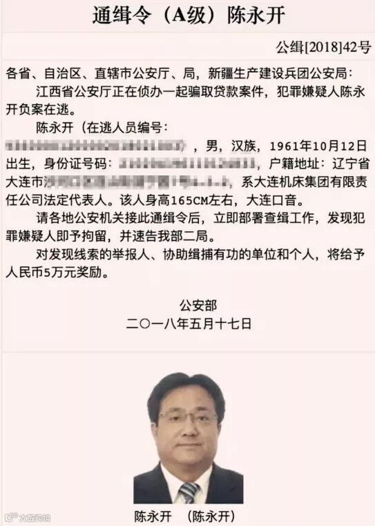 据悉,公安部在5月17日发出了一封A级通缉令,被通缉的对象正是大连机床的法定代表人、董事长陈永开,目前该通缉令也已经在网络上传播开来。