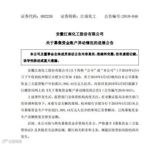 5月10日早间,江南化工发布公告称,杭州银行合肥分行此前从公司募集资金专户中扣划约2.11亿元事项已妥善解决,已将募集资金专户余额恢复至原有金额。