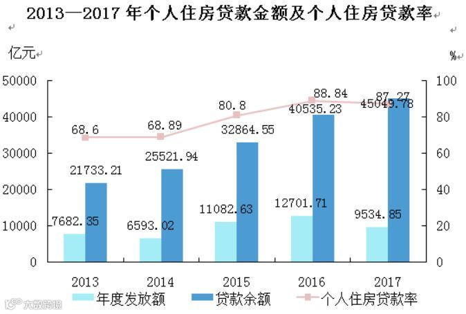 2017年末,累计发放个人住房贷款3082.57万笔、75602.83亿元,分别比上年末增长9.05%和14.44%;个人住房贷款余额45049.78亿元,比上年末增长11.14%;个人住房贷款率87.27%,比上年末减少1.57个百分点。