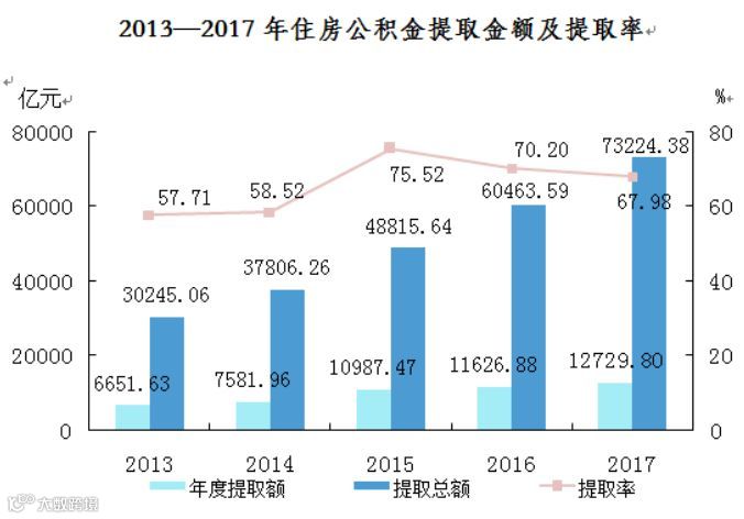 2017年末,住房公积金提取总额73224.38亿元,占缴存总额的58.65%。