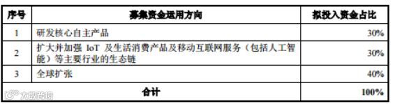 即研发核心自主产品拟投入资金占比30%;扩大并加强IoT及生活消费产品及移动互联网服务(包括人工智能)等主要行业的生态链拟投入资金占比30%;全球扩张拟投入资金占比40%。