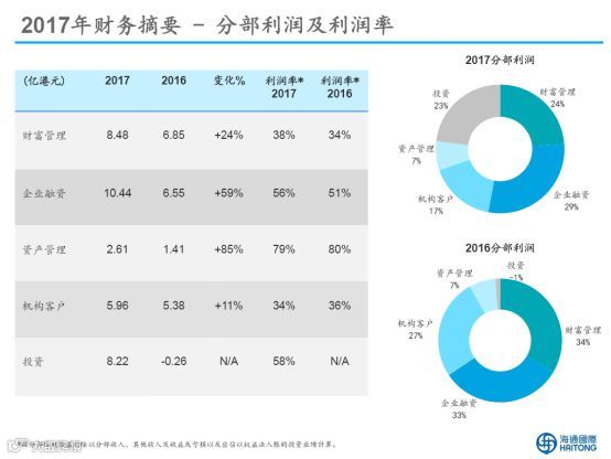 年报显示,2017年海通国际的企业融资业务净利润占比最大,更较去年同期大幅提升,增长了59%;财富管理业务作为收入贡献占比最大的业务,在2017年整合升级,包含零售经纪,私人财富管理及超高净值财富管理,架构与外资行接轨,其港股日均交易量同比增长约28%,债券成交额达183亿港币,同比大增346%。
