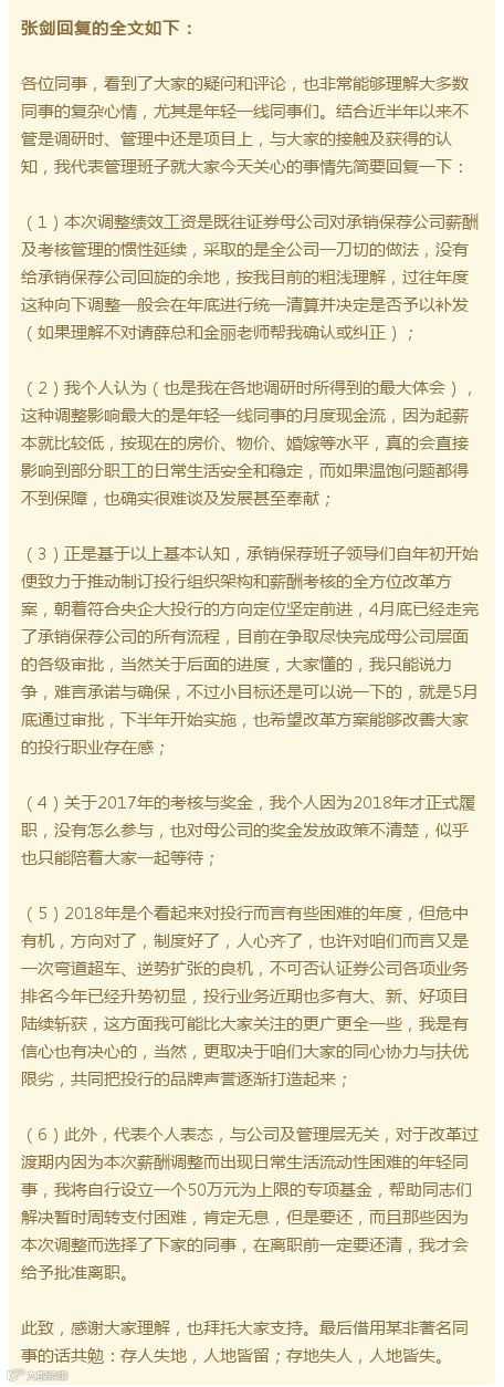今年一月刚从中信证券跳槽至申万宏源承销保荐任总经理的张剑第一时间对薪酬调整事项在内部做出回应。