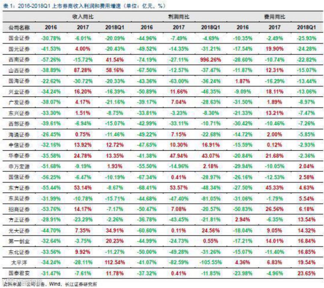 中国证券业协会的数据显示,2018 年一季度,证券公司实现营业收入 659.64 亿元,同比下降 7.22%;营业支出 376.46 亿元,同比增长 1.60%;实现净利润235.59 亿元,同比下降 17.22%。