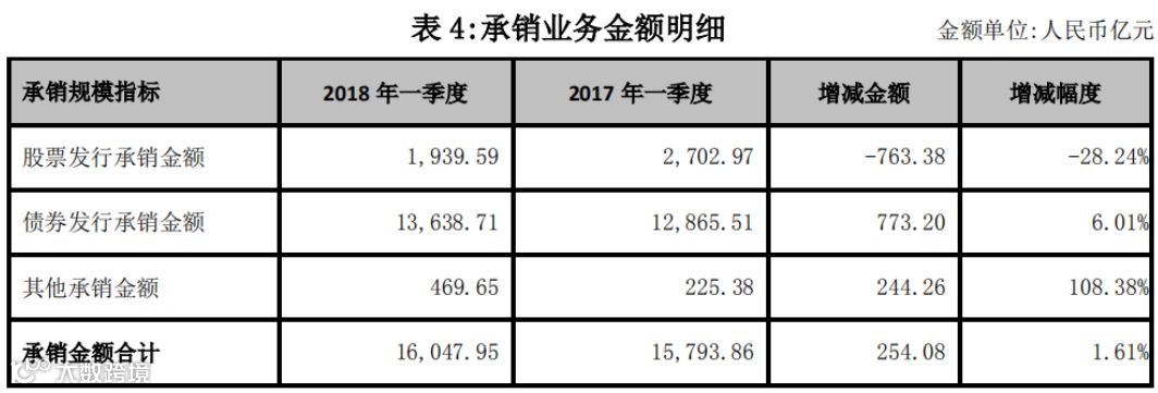 从承销量来看,2018 年一季度募集资金总规模达到 1.60 万亿元,同比增长 1.61%,其中,承销股票 1,939.59 亿元,同比下降 28.24%,占当期证券承销业务总额的 12.09%;承销债券 1.36万亿元,同比增长 6.01%,占证券承销业务总额的 84.99%。
