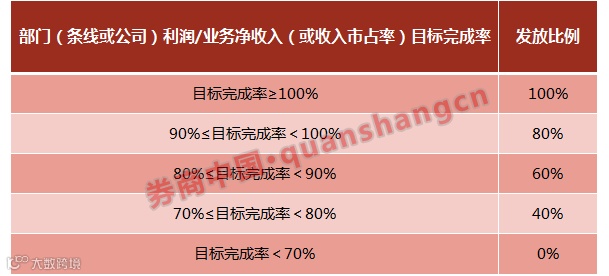 考核方法为:占基本薪酬30%的绩效工资与各部门(条线)利润目标完成率挂钩,由公司直接核定。具体挂钩情况为: