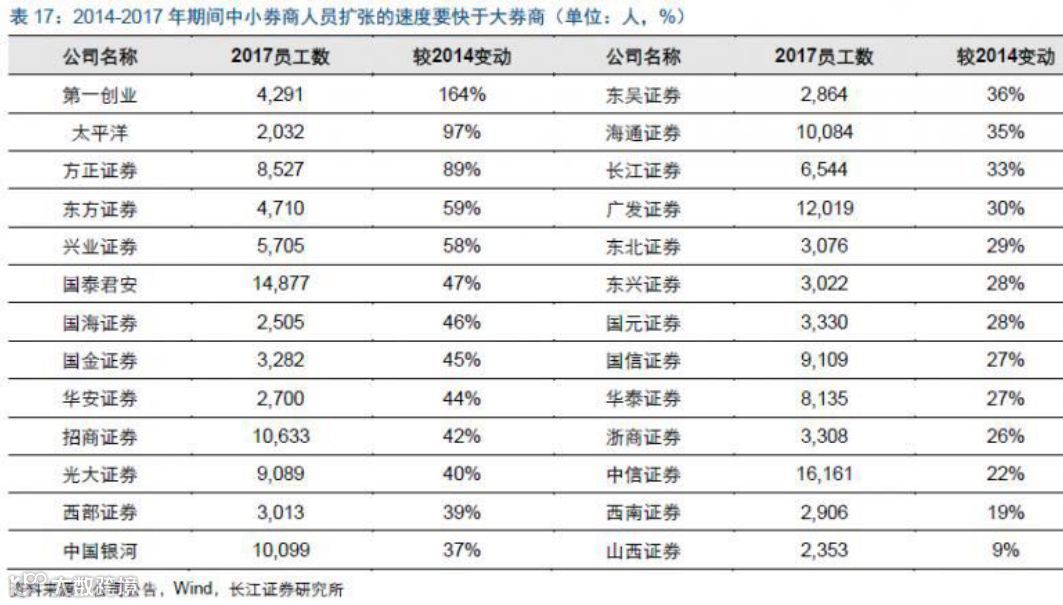 另一方面,2014-2017年期间,证券行业从业人员数量快速提升,中小券商扩张速度尤其要快于大型券商,但是市场疲软环境下券商的费用创收能力和费用创利能力连续下滑,牛市后遗症现象逐步显现。市场景气度下行券商加大费用管控本身情有可原,但业务发展难以一蹴而就,如何把握费用控制和业务发展之间均衡,或将成为券商下一阶段分化的重要因素。