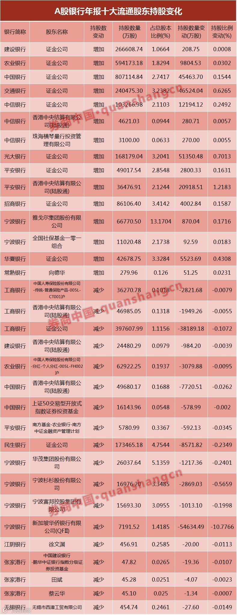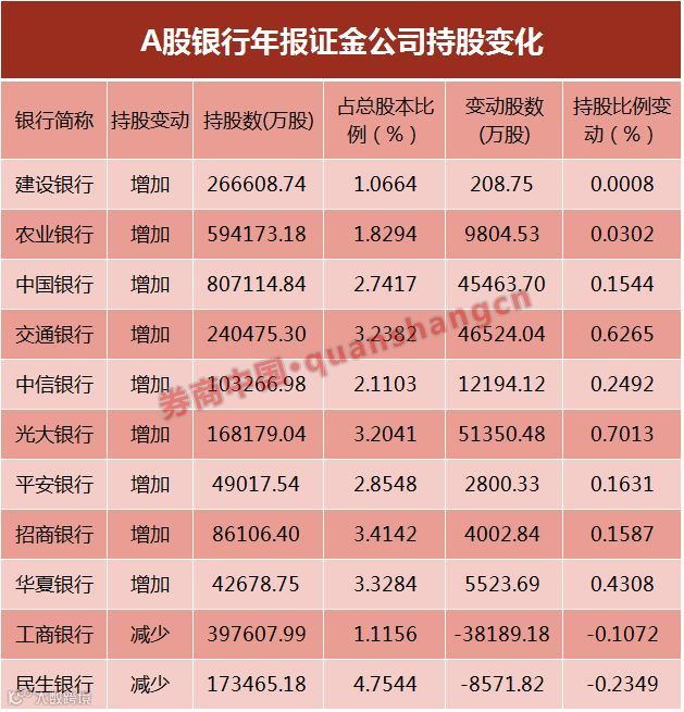 这些持股数变动的银行股东中,证金公司频频现身,上榜11次;其中9次分别对建行、农行、中行、交行、中信银行、光大银行、平安银行、招商银行和华夏银行持股数加码。