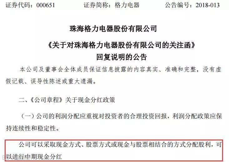 格力电器不分红为哪般?今天市场猜测纷纷一天,深交所也第一时间发出关注函,要求说明2017年度未进行现金分红的具体原因及合理性,说明是否切实保护了中小投资者的利益。还好,就在今日晚间,格力给出了中期分红的明确预期。